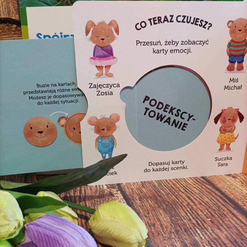 Obie książeczki pięknie się prezentują i z pewnością przetrwają nie jedno czytanie oraz ciekawskie łapki małych czytelników. Grube tekturowe strony skrywają wiele interesujących rzeczy, które nie tylko uatrakcyjniają czytanie, ale również ćwiczą sprawność rączek, spostrzegawczość oraz uczą wielu ciekawych rzeczy. W Co czujesz? dziecko ma do dyspozycji elementy z twarzami o różnych emocjach, a jego zadaniem jest dopasować je do konkretnych sytuacji. W Spójrz, jak rosnę! młody czytelnik za pomocą ruchomych elementów będzie mógł się zapoznać z etapami wzrostu roślin czy też zmian, jakie zachodzą w zwierzętach, gdy dorastają.
