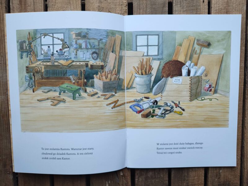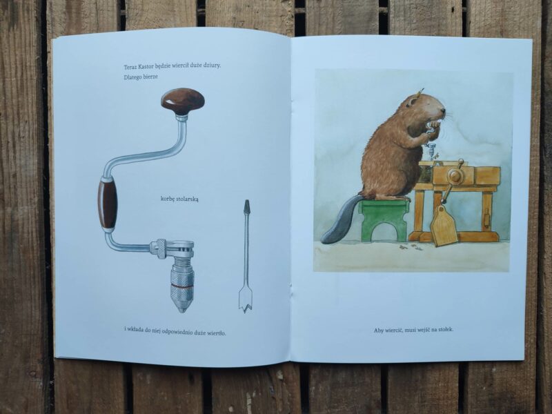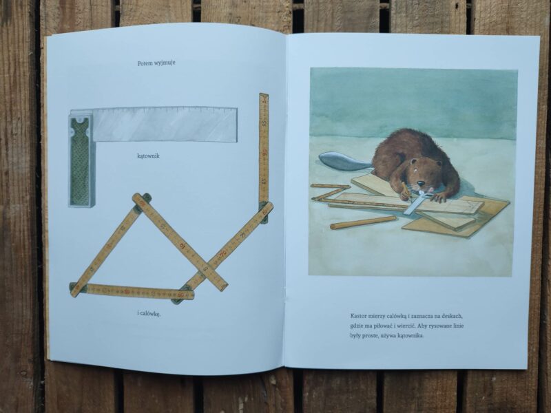 W tej części przygód Kastora możemy zobaczyć, jak ten pomysłowy Bóbr tworzy coś z niczego, czyli po prostu majsterkuje. Dzięki temu tomowi poznajemy konkretne nazwy narzędzi służących do obróbki drewna, m.in. kątownik, calówkę, piłę kabłąkową, pilnik, papier ścierny i jeszcze parę innych. Podczas lektury przyglądamy się jak Kastor powoli, dokładnie i skrupulatnie coś buduje. Ja na początku myślałam, że może być to deska do krojenia, ale projekt okazał się bardziej złożony. Główny bohater bardzo konkretnie podchodzi do tematu.