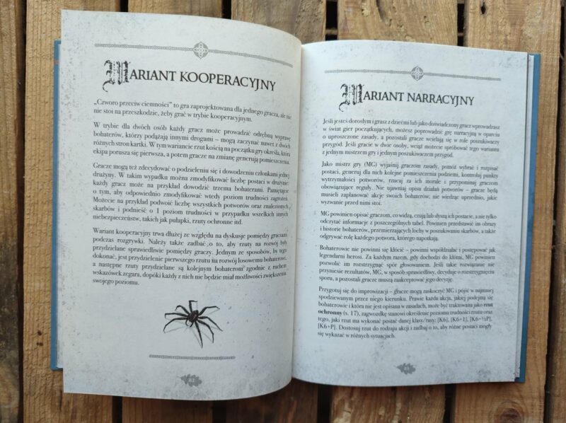 „Czworo przeciw ciemności” to książko-gra, w której to my decydujemy, w jakim kierunku podążają nasi bohaterowie. Głównym zamysłem jest jednoosobowa rozgrywka, ale istnieje możliwość dołączenia innych graczy. Naszym zadaniem jest eksploatowanie podziemi, walka z potworami, zbieranie artefaktów i finalnie pokonanie Króla. Klasyczna przygoda, można by powiedzieć. Istnieje jednak element losowy – rzut kostką, który często zmusza do podjęcia spontanicznych decyzji. Dzięki temu gra staje się bardziej dynamiczna i nieprzewidywalna.