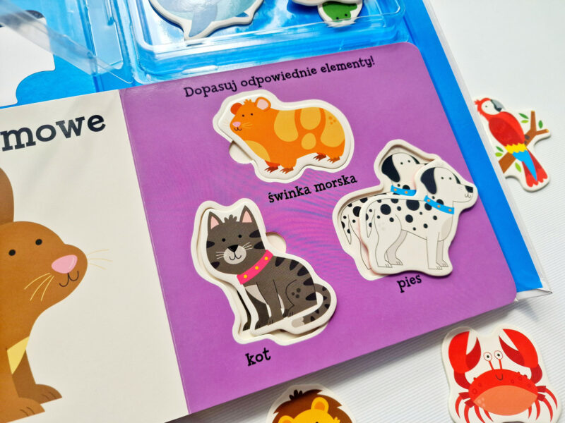 Publikacja wprowadza maluchy w świat zwierząt. Ćwiczy małą motorykę poprzez manipulację puzzlami. Wspiera koncentrację i spostrzegawczość. Rozwija słownictwo związane ze zwierzętami i ich środowiskami. Jestem pewna, że za każdym razem maluch będzie pokazywał kolejne zwierzęta, pytając „co to?”. Przynajmniej dopóki nie zapamięta nazw i dźwięków, jakie wydają.