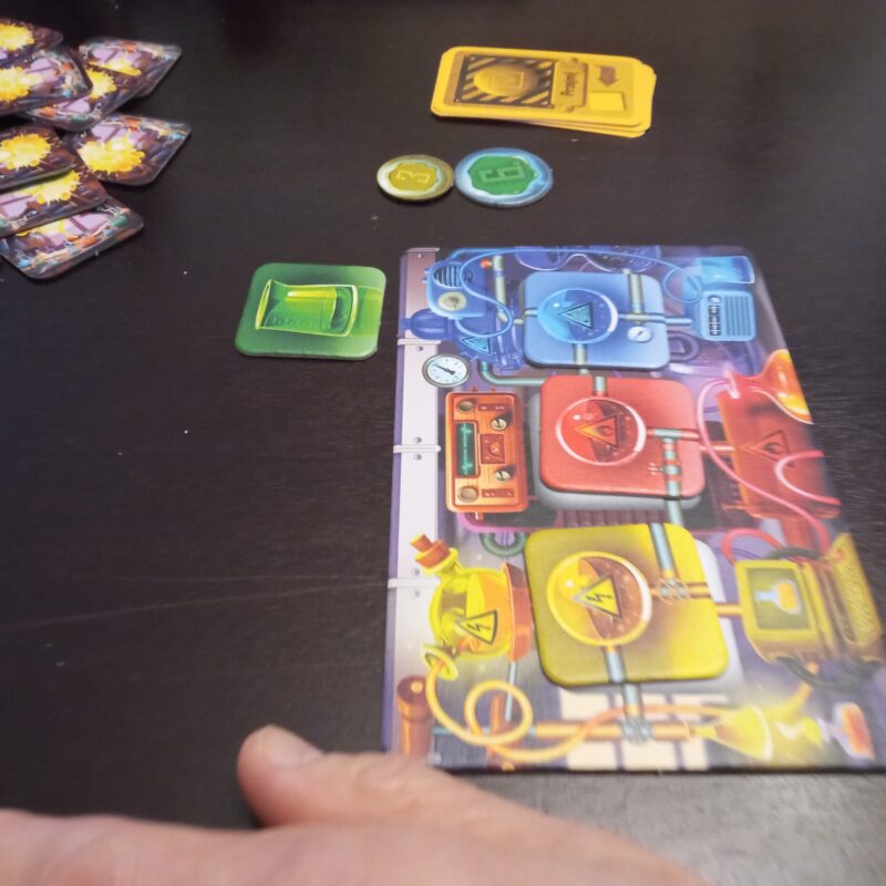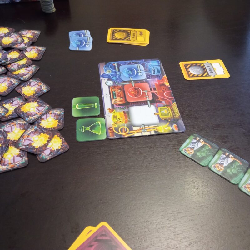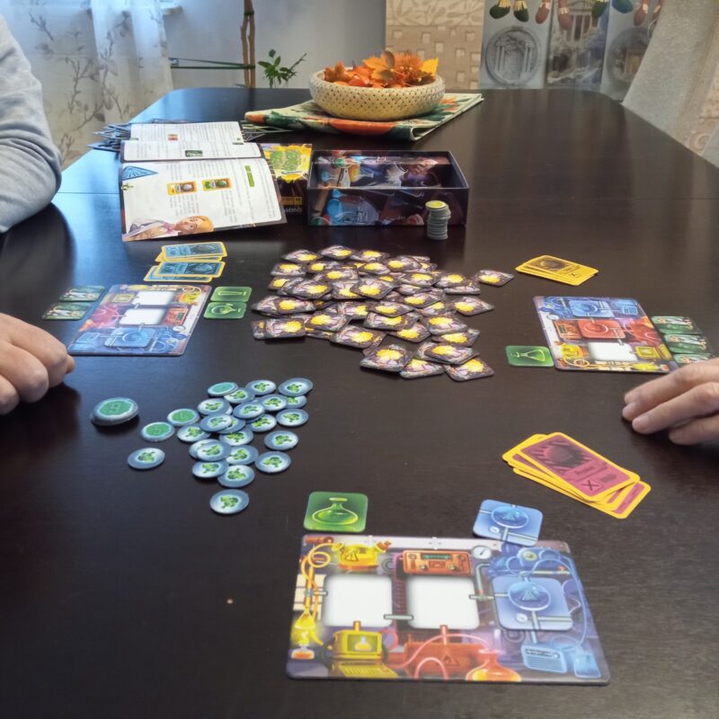 Pogoń za żetonem mocy o najwyższej wartości, zapewniającym zwycięstwo, przybierała różne scenariusze. Wielokrotnie było tak blisko sięgnięcia naukowy sukces, a nagle złośliwy przypadek odsuwał od udziału w rundzie. Niecierpliwie sięgaliśmy po kafelki, dobieraliśmy je z ryzykiem i obawą, co wyciągniemy. Czasem potrzebny był kafelek elektryczności, kiedy indziej temperatury, albo wreszcie ciśnienia. Jeśli kafelki powtórzyły się, nasze mikstury wybuchały i dochodziło do katastrof. Mogliśmy też odkryć potężny układ prądotwórczy. Nad planszą eksperymentu pojawiały się naczynia z eliksirami, natomiast pod nią kafelki z kocim asystentem. Baliśmy się przekroczenia masy krytycznej, ale zyskiwaliśmy na wynajdywaniu nowych substancji lub formułowaniu kolejnej grupy badawczej. Na nasze szczęście i na przekór przypadkowości, dysponowaliśmy kartami awaryjnymi, ale mieliśmy świadomość, że tylko jedna mogła być użyta.